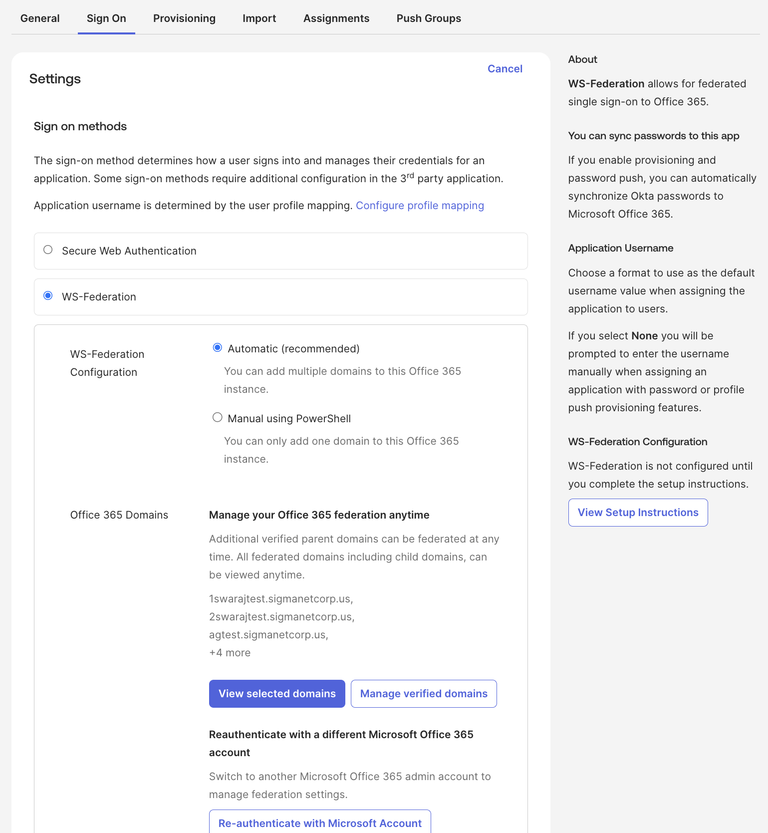 You can enable users to sign in to Office 365 using either SWA or WS-Federation. When possible, Okta recommends WS-Federation because it's more secure than SWA.