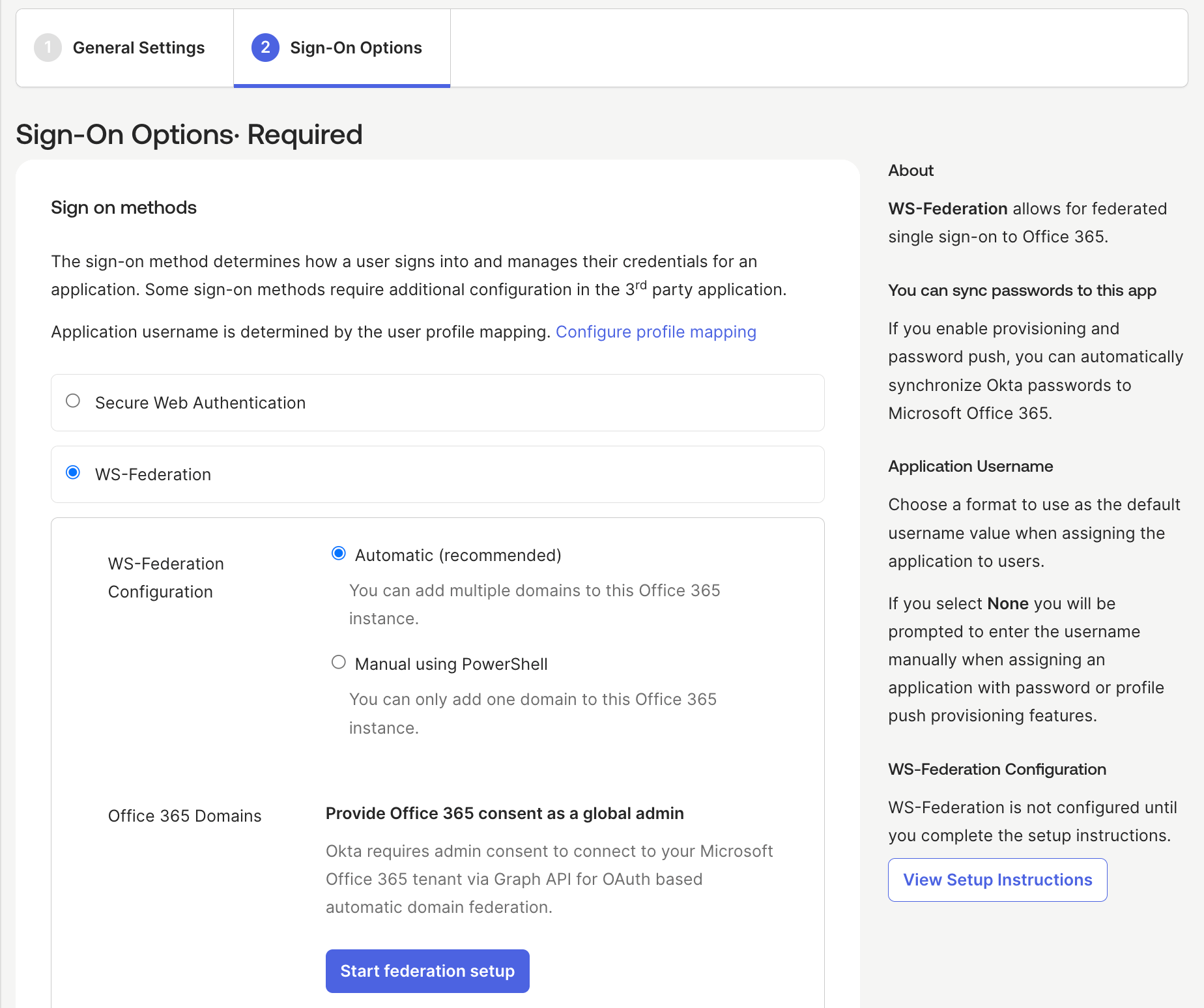 There are two ways of configuring WS-Federation: automatic and manually. You can allow Okta to automatically configure WS-Federation or you can manually configure it using the customized PowerShell script provided by Okta. Okta recommends configuring WS-Federation automatically because back-end procedures are managed by Okta.
