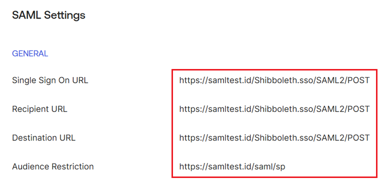 For SAML apps, the General tab shows the correct Application label and URL. The SAML Settings section on the General tab shows the correct Single Sign On URL, Recipient URL, Destination URL, and Audience Restriction.