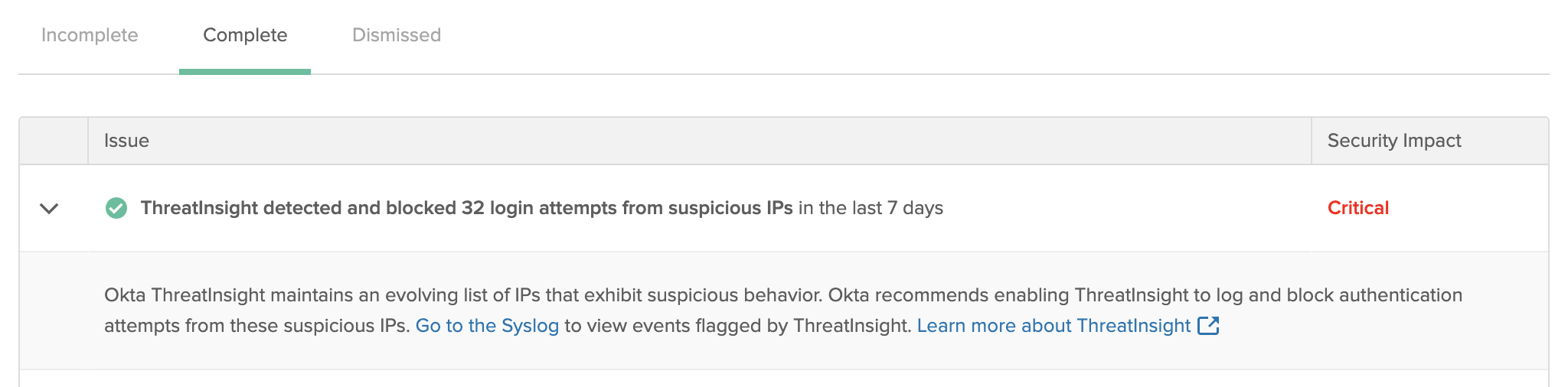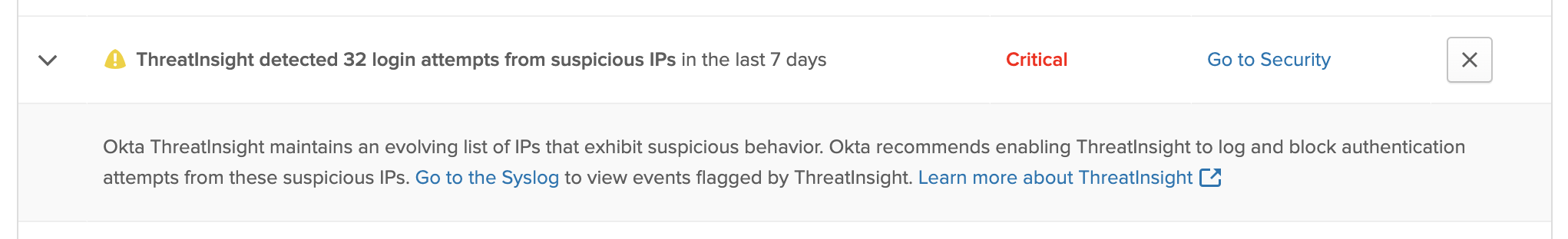 The number of suspicious sign-in attempts detected can be underestimated. Okta ThreatInsight may limit the events reported if the frequency of suspicious sign-in attempts is too high.