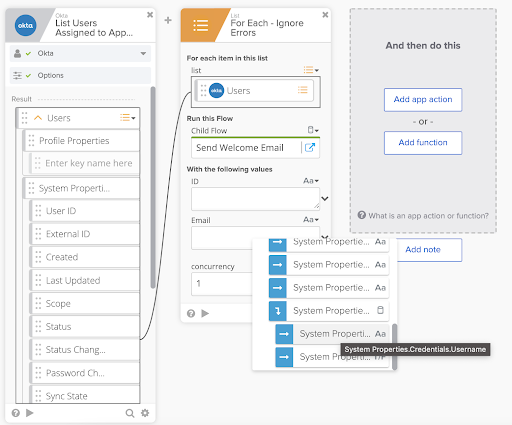 Be mindful that non-streaming result set options lead to increased flow memory use. Cards that feature the option Stream Matching Records in the Result Set field support streaming actions. The Find Users, List Users with Search, and List Users Assigned to Applications action cards for the Okta connector return lists and support streaming. See Stream matching records with a helper flow.