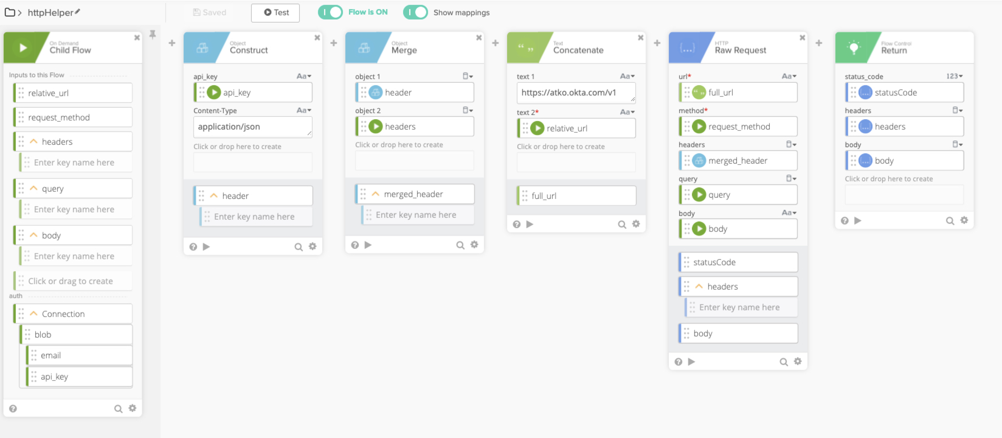 Here's an example of what a complete httpHelper flow looks like in Okta Workflows: