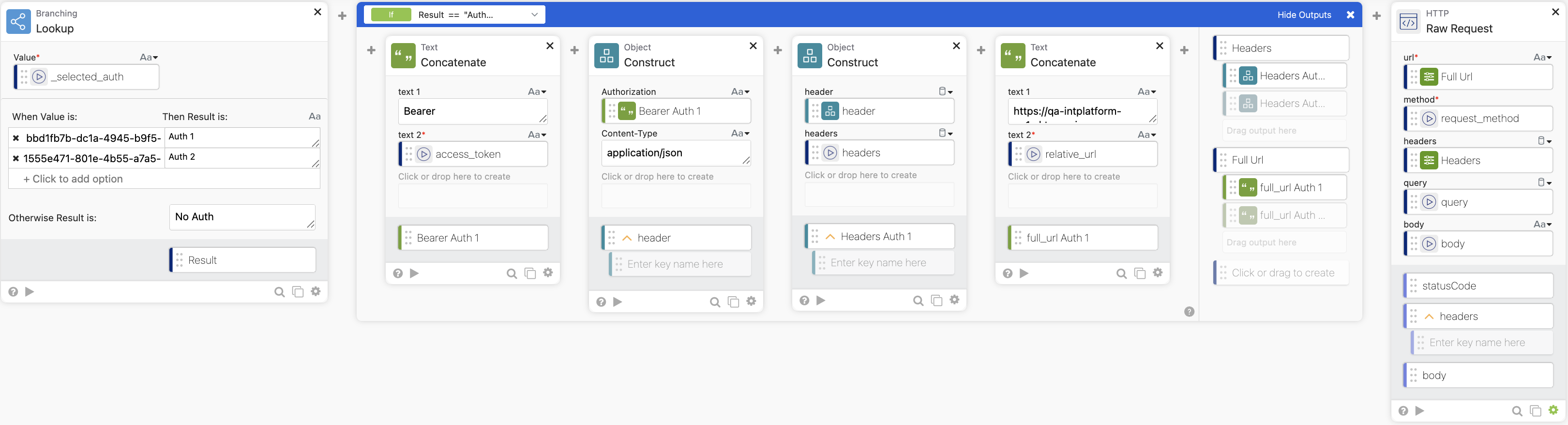 The next task builds out a series of cards to construct the proper objects for the HTTP call. Which option you choose depends on the authentication type you need to use.