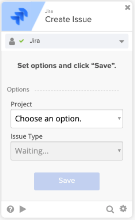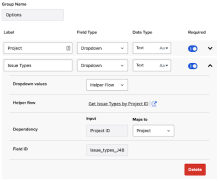 For example, assume you are creating a card with two options fields, both of which are dropdowns, and they are named Project and Issue Type. The Issue Type dropdown will be populated with values only after the user selects a project from the Project dropdown. Because the Issue Type helper flow requires a selection in the Project field by the card user, the Issue Type option is "dependent" on the Project option. The Jira connector Create Issue action card contains the same design.