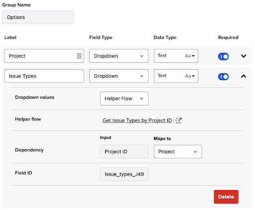 This helper flow makes a request to the service to return a list of issue types available based on the project selected by the card user. When the Issue Type option is created, and the Get Issue Types by Project ID flow is selected, the dialog will detect the Project ID input defined on the helper flow card and allow the input to be mapped to the value that was retrieved from the Project option.