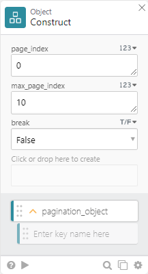 3. In the Run when TRUE row (that is triggered when the page_index equals the max_page_index), add the Unset object function to remove the break key. When the resulting pagination object returns to the parent flow, the Paginate function checks for the break path. If that path isn't found in the updated object, the function completes by stopping the pagination.