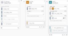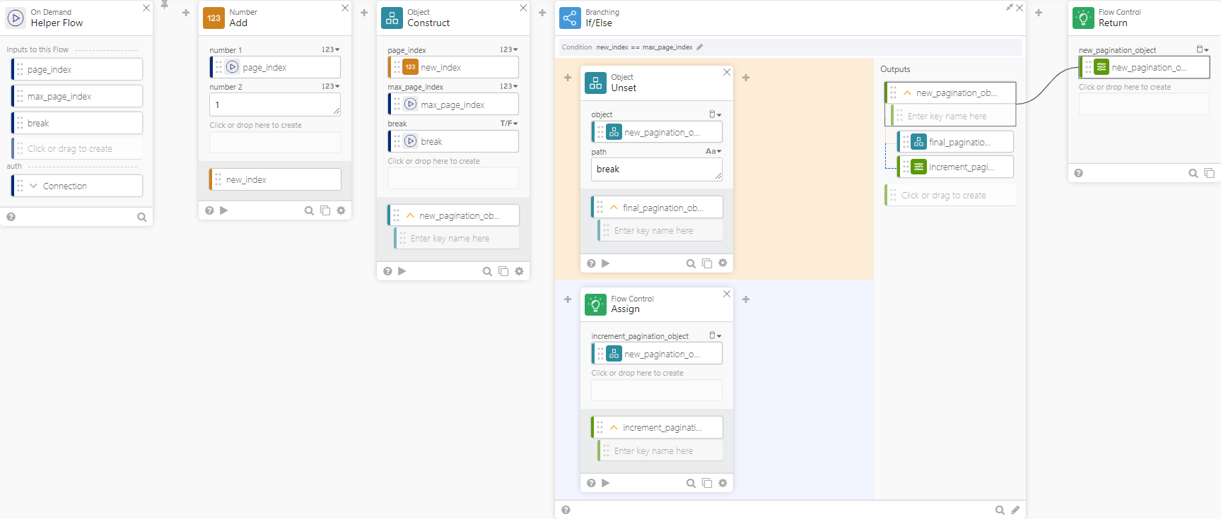 When the helper flow executes, you need to manage the values passed into the flow. The goal is to track the number of iterations made by the pagination function, so you need to increase the page_index value with each iteration. You can accomplish this with the Add number function card.