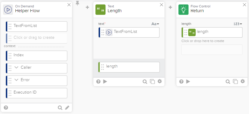On the card, define the fields to use as the inputs for the helper flow to determine the unique value. Typically you include a field for each item of the list, for example, if the list is a list of text, then one of the inputs should be a string. You can also include whatever other inputs your flow needs to calculate the sort value. If you need to know the position of the current item within the list, use the Index field from the context section of the helper flow card. Then build the rest of the helper flow, ending with a Return card that returns just a single value. The name for the value on the Return card doesn't matter. Save the helper flow and turn it on.