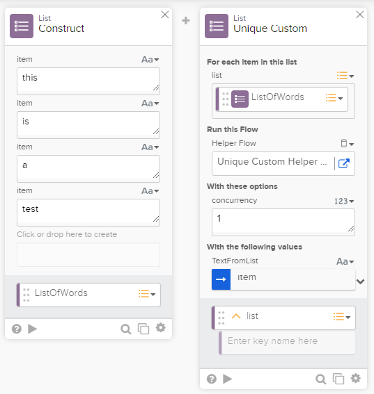 On the Unique Custom card in your main flow, input the list you want to evaluate, and then select the helper flow you built. The inputs are automatically populated so you can map data into them. To map an input to accept each item of the list, click in that input field to see an Item dropdown menu and select that item. Or, if your list is a list of objects, you may also see the schema of the object, that is, the keys that it contains. You can build your helper flow to accept those keys as inputs. In addition, you can drag in outputs from previous cards in the flow. In that scenario, the same value is used for each item in this list.