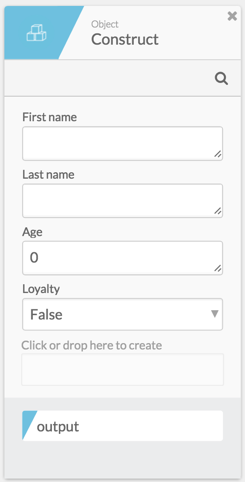 Use the Construct function card to create inputs for each key name and set the input types. Both the First name and Last name fields are text fields. The Age field should be a number and Loyalty is a true or false value.