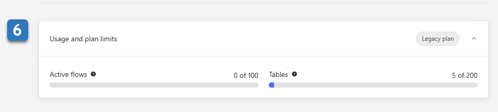 The Usage and plan limits dashboard displays the number of active flows in your Workflows org, and the number of tables currently in use. The progress bars indicate the number of remaining flows and tables available according to your subscription. Super admins can use the dashboard to contact the Okta sales team and get more flows by upgrading their plan.