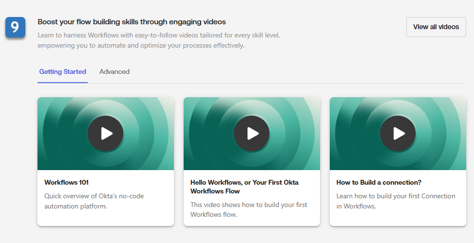 Use the Getting Started and Advanced tabs to access educational videos and tutorials. These show you how to use Okta Workflows and how to maximize its potential for your business.