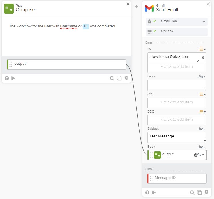 - Drag the output of the Compose card to the Body input field of the Send Email card.