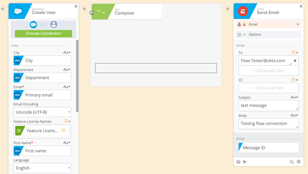 - Drag the Compose card to the left, and position it between the Salesforce Create User and Gmail Send Email cards.