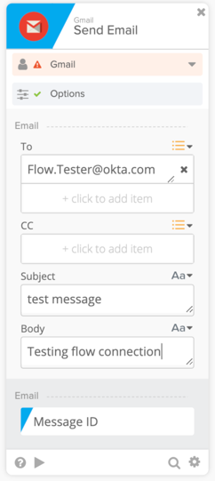 - Test the new Send Email card. Enter your email address, a subject, and a test message, and then click the card's Run this card icon.